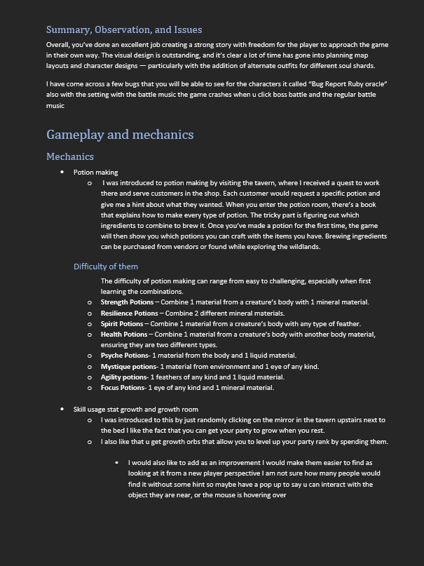 "This PDF shows the full game report layout I use when testing games. It covers areas such as visuals, gameplay mechanics, story, and sound, and ends with a detailed evaluation. Each section includes a summary, key observations, and any issues I encountered during testing."