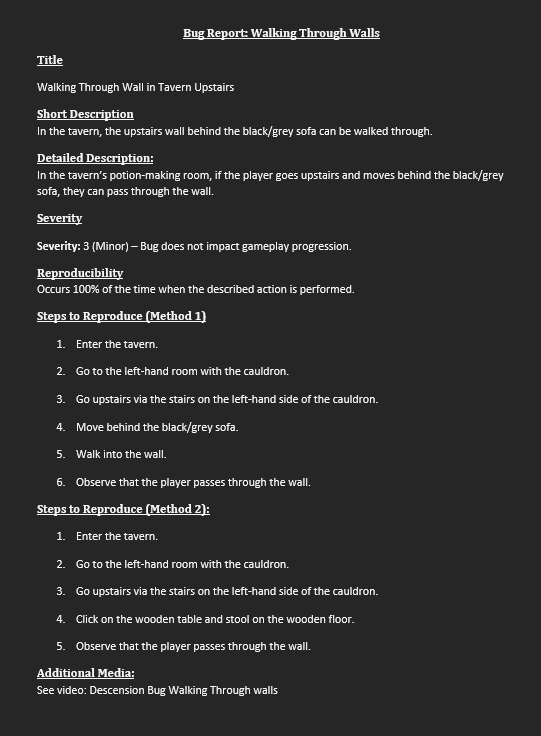 "As part of a Fiverr QA testing gig, I tested the game Desension and identified a bug. I then documented the issue in a professional bug report format, which you can view here."